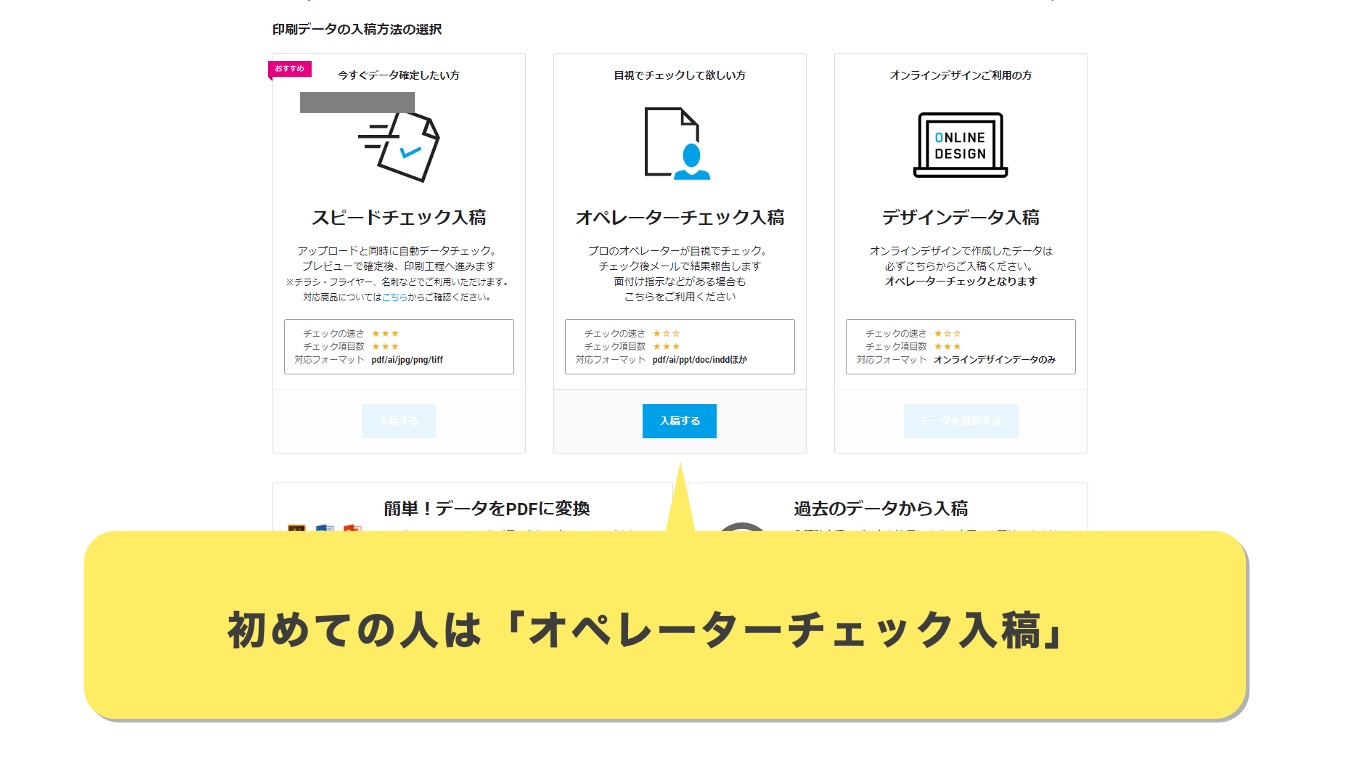 印刷に慣れている方、印刷物がカンタンなチラシや名刺の方は問題ないと思いますが、初めてラクスルを利用する方やパンフレット・冊子を印刷する場合は「オペレーターチェック入稿」がお勧めです。
