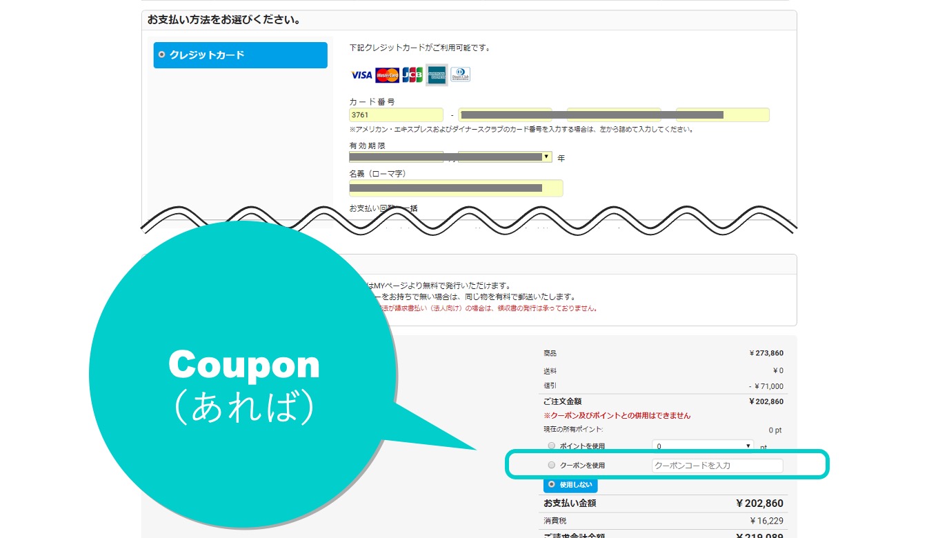 支払いに関してはかりやすので迷う方はほぼいないと思います。振込は面倒なのでクレジット払いがスムーズでおススメです。会員登録をしていればマイページが利用できるようになり、各種クーポンが不定期に発行されますので、うまく活用してください。