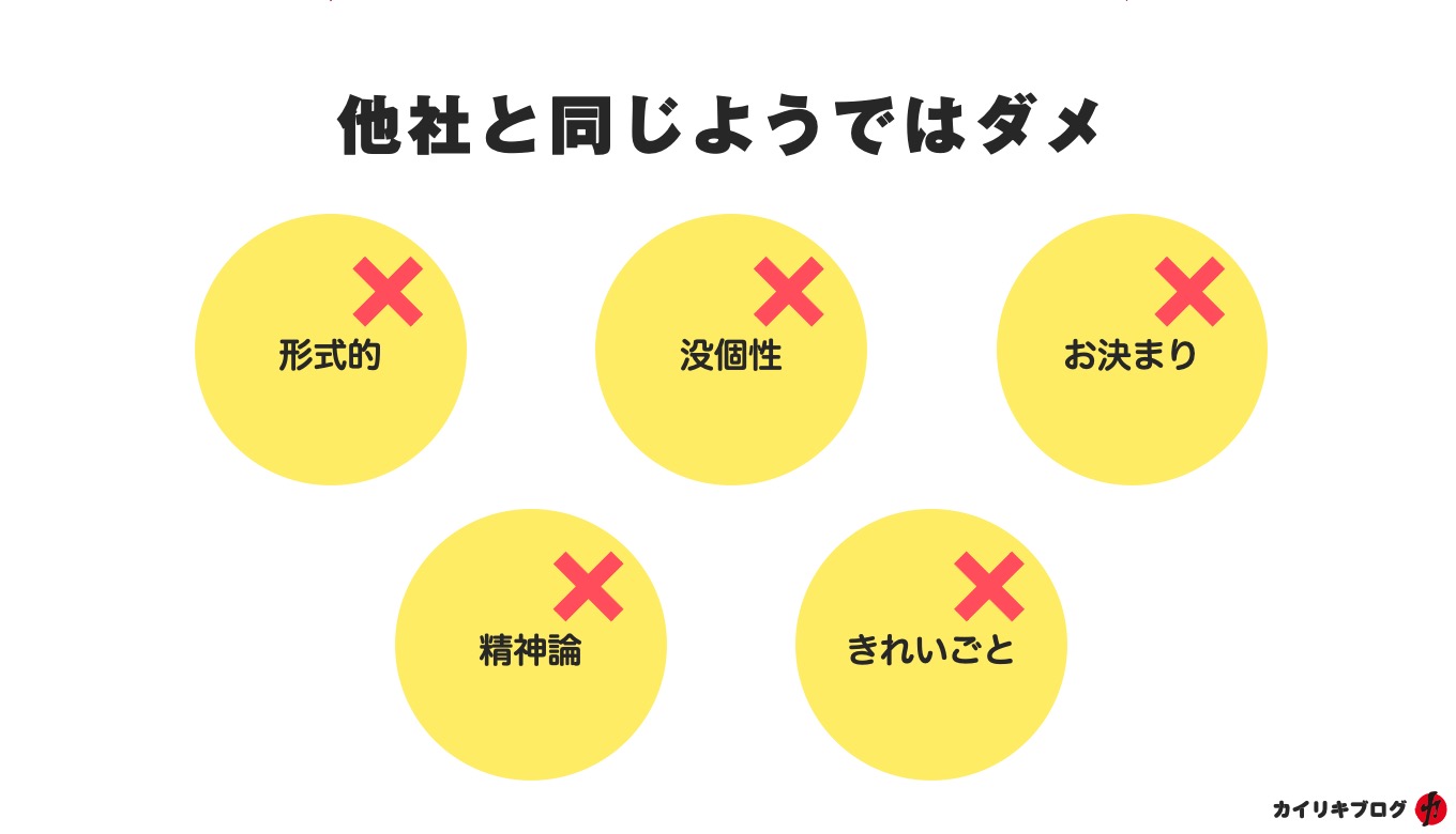 当然ですが、業界のリーダーと3番手では、自ずとビジョンも戦略も異なるはずですが、社長メッセージを読む限り同じように見えます。独自の強みも戦略もなく、景気の波に上下するだけの企業に見えてしまいます。そんな魅力のない企業に見られていていいのでしょうか?